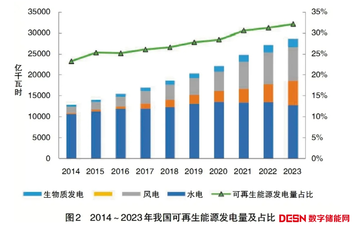 發(fā)電量方面,我國可再生能源發(fā)電量持續(xù)增長,成為我國新增發(fā)電量主體。2023年,全國可再生能源年發(fā)電量接近3萬億千瓦時,較2014年的1.2萬億千瓦時增加150%。在可再生能源發(fā)電量增長的推動下,2023年,全國清潔能源發(fā)電量31906億千瓦時,占全部發(fā)電量的36.97%,與2014年相比增長約11個百分點(見圖2)。水電受豐水期來水偏枯、主要水庫蓄水不足及降水持續(xù)偏少等因素影響,近兩年發(fā)電量占比略有下降,但水電仍然是貢獻可再生能源發(fā)電量的主要電源,其發(fā)電量從2014年的10661億千瓦時增加到2023年的12774億千瓦時,增加約20%。同時,太陽能發(fā)電和風力發(fā)電量增長迅速,2023年,太陽能和風力發(fā)電量分別為5833億千瓦時、8090億千瓦時,與2014年相比分別增長約22倍、4倍,二者發(fā)電量之和首次超過水電。