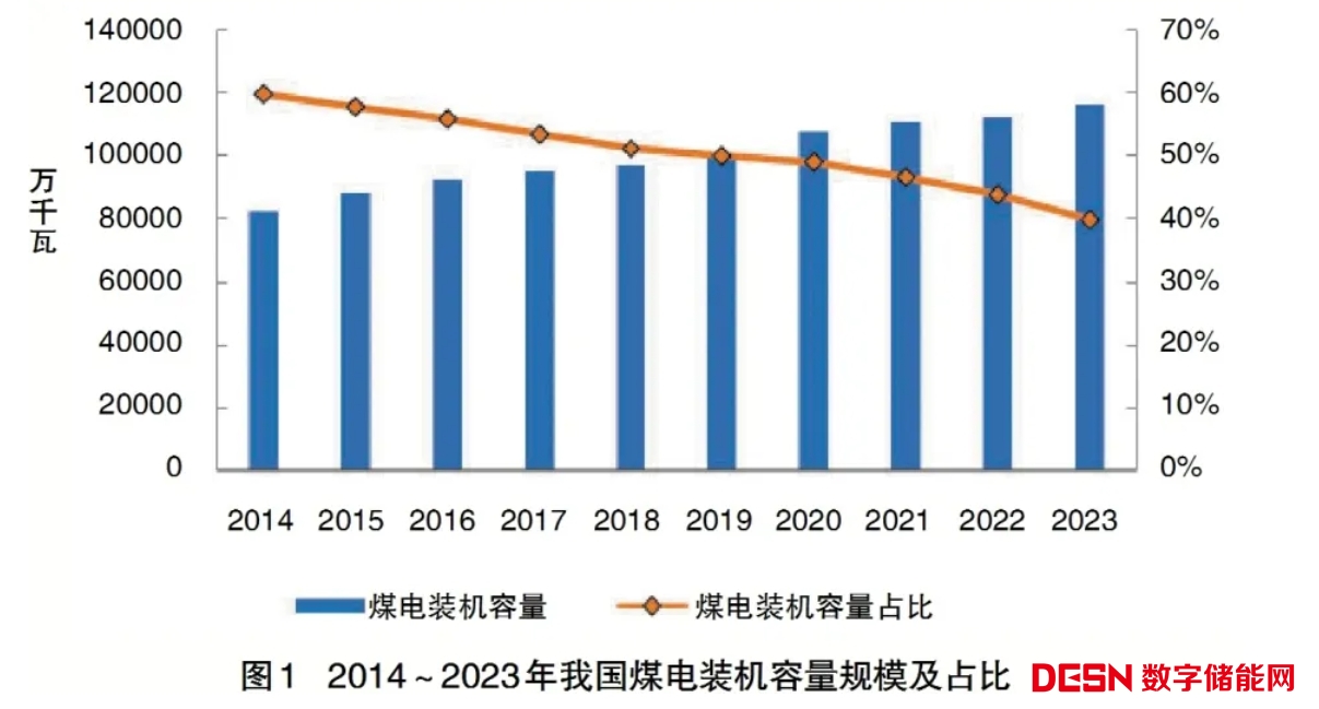 近十年來,煤電裝機規(guī)模得到較好控制(見圖1),雖然2014~2023年煤電裝機容量逐年增長,但其裝機容量占比卻逐年降低,響應(yīng)了“嚴控煤電裝機規(guī)?!钡囊?,不盲目新增煤電機組裝機容量,裝機增長明顯放緩。2023年,煤電裝機116500萬千瓦,占全國總裝機容量的39.90%,與2014年相比,裝機占比下降接近20個百分點,發(fā)電側(cè)裝機結(jié)構(gòu)低碳化成效顯著。
