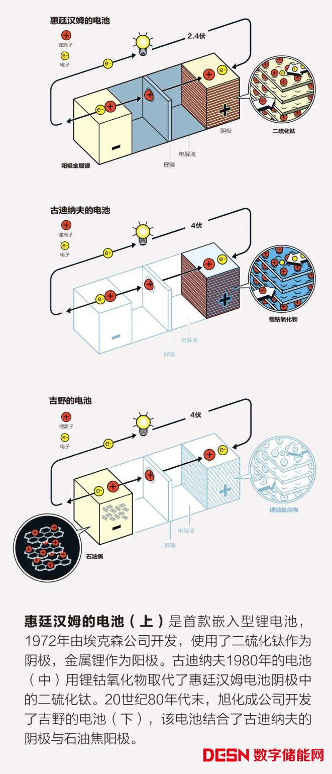 惠廷漢姆的電池與之前的任何電池都不同。其工作原理是將離子插入電極材料主體的原子晶格中,該過程稱為嵌入。其性能也前所未有:既可充電,又具有很高的能量輸出。在此之前,最好的可充電電池是鎳鎘電池,其最大輸出電壓為1.3伏。與之相比,惠廷漢姆的新化學(xué)電池的輸出達(dá)到了驚人的2.4伏。