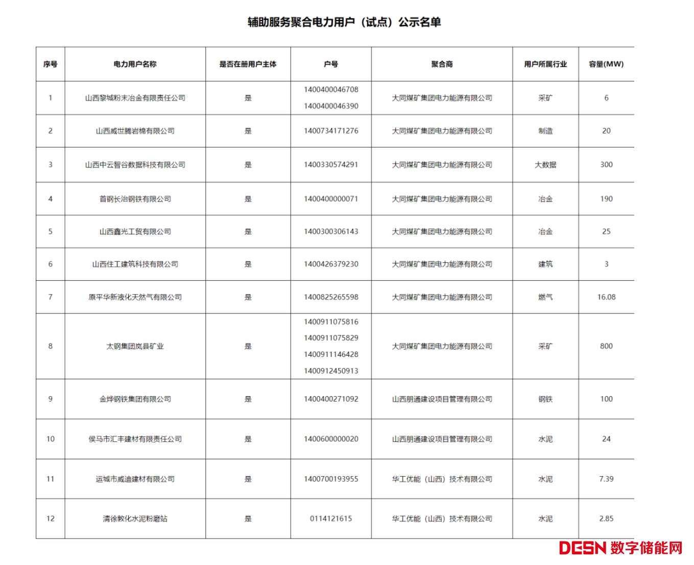將輔助服務聚合商大同煤礦集團電力能源有限公司、山西朋通建設項目管理有限公司、華工優(yōu)能(山西)技術有限公司代理的企業(yè)(試點)予以公示。