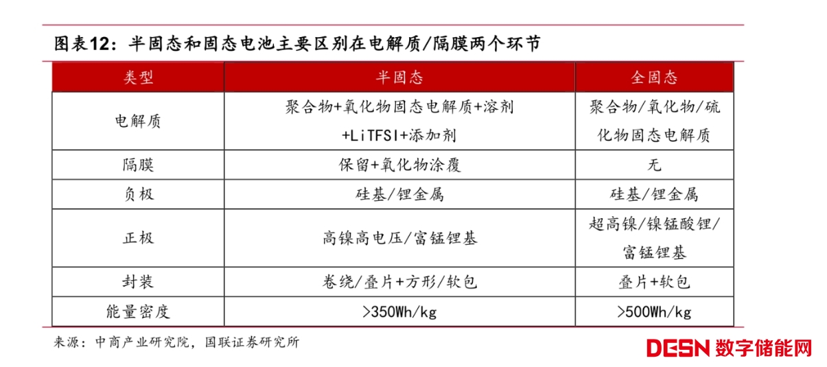 不過,據(jù)國聯(lián)證券研報,半固態(tài)和全固態(tài)在正負(fù)材料路徑選擇上較為一致,正極偏向于高鎳和富錳鋰基材料,負(fù)極采用硅基材料和鋰金屬。從半固態(tài)發(fā)展為全固態(tài)的核心轉(zhuǎn)變?nèi)詾殡娊赓|(zhì)和隔膜材料的改變,全固態(tài)電池將不再依賴溶劑、添加劑等液態(tài)物質(zhì)。