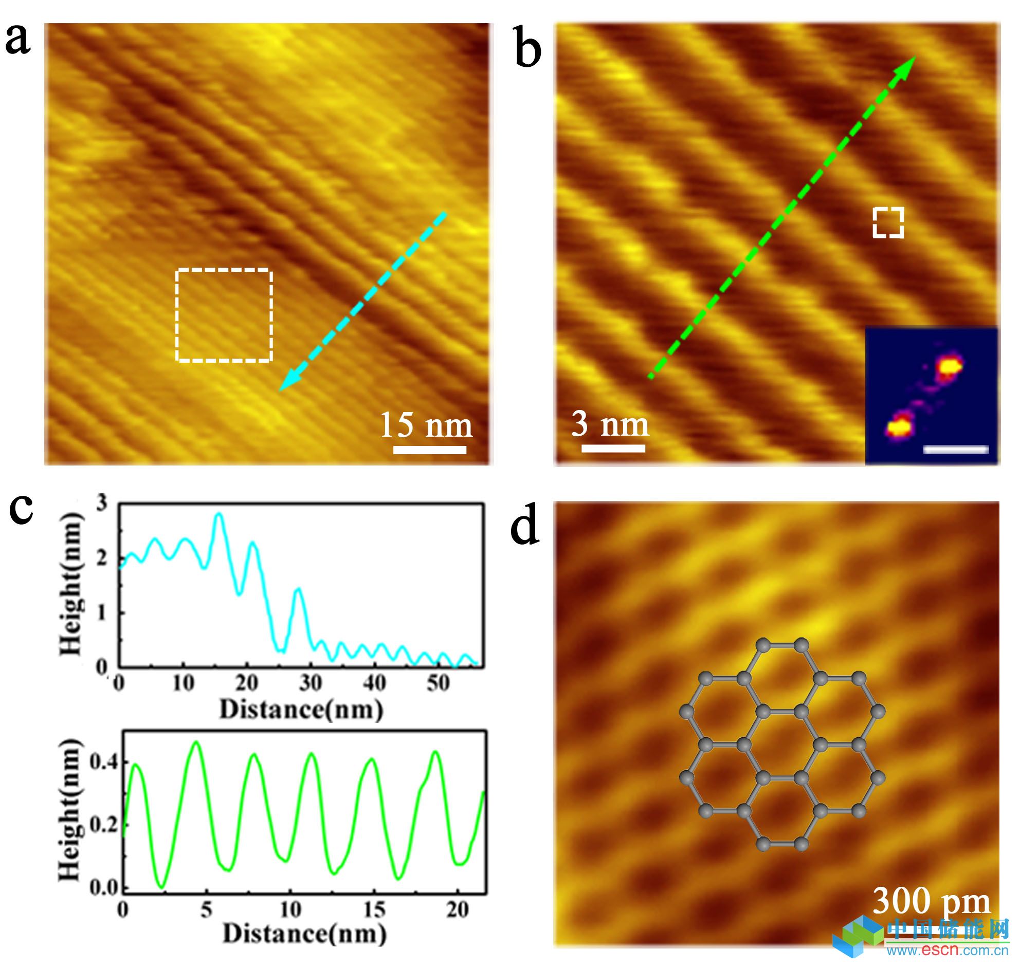 何林指出他們?cè)谑┲袑?shí)現(xiàn)的納米尺度的準(zhǔn)一維周期性褶皺超出了經(jīng)典薄膜理論的描述。在經(jīng)典薄膜理論中,具有一定厚度的薄膜在彎曲時(shí)存在一個(gè)中性面,中性面上的原子間距在薄膜彎曲時(shí)既不會(huì)被拉伸又不會(huì)被壓縮,而中性面以外的原子在薄膜彎曲時(shí)原子間距不是被拉伸就是被壓縮,從而產(chǎn)生一個(gè)彎曲,能阻礙薄膜的進(jìn)一步彎曲。但是石墨烯是一種非常特殊的薄膜體系:它只有一層原子厚。這一特性導(dǎo)致石墨烯彎曲時(shí)幾乎沒有阻力(只需要考慮最近鄰碳原子p軌道雜化對(duì)體系能量的細(xì)微影響),因此該體系中納米尺度的褶皺不再符合經(jīng)典薄膜理論的描述,所以在實(shí)驗(yàn)上能實(shí)現(xiàn)波長(zhǎng)僅為幾個(gè)納米但長(zhǎng)度達(dá)到400納米到一微米之間的準(zhǔn)一維周期性褶皺(如圖1)。另外,該課題組的實(shí)驗(yàn)結(jié)果還表明周期性的褶皺會(huì)在石墨烯中引入一個(gè)周期性的電勢(shì),在其能帶結(jié)構(gòu)上產(chǎn)生超晶格Dirac點(diǎn),并可以在石墨烯中打開一個(gè)130 meV的帶隙。