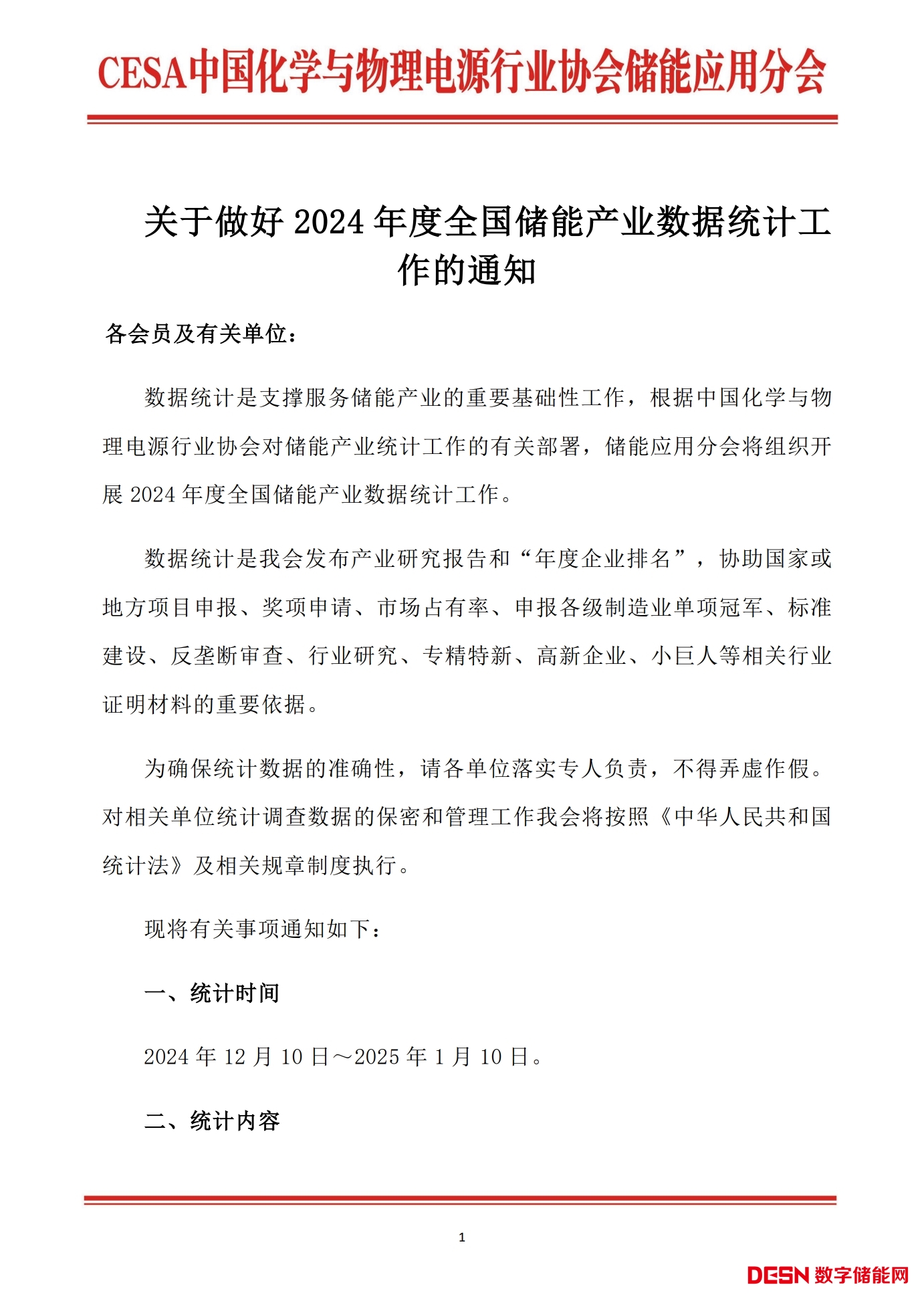關(guān)于做好2024年度全國儲能產(chǎn)業(yè)數(shù)據(jù)統(tǒng)計工作的通知