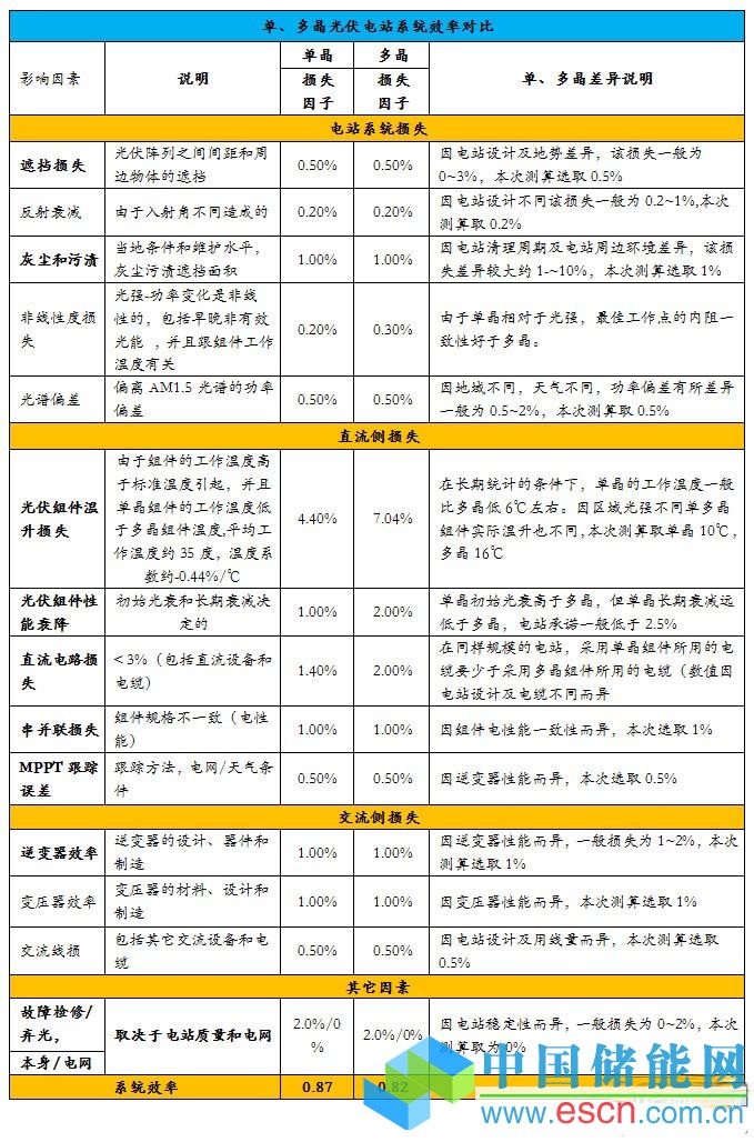 從光伏電站系統(tǒng)效率分析表中可以看出單多晶在發(fā)電效率方面因其晶體結(jié)構(gòu)差異有4個(gè)方向存在不同: