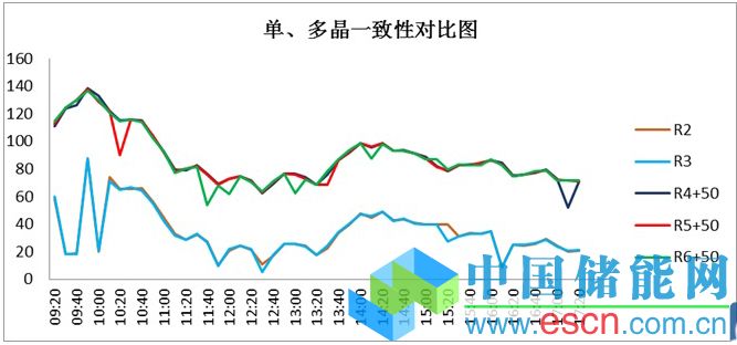 單多晶發(fā)電量與太陽(yáng)輻射值的變化趨勢(shì)相似。根據(jù)最大功率點(diǎn)電子負(fù)載的阻值,反應(yīng)出單晶組件的一致性要比多晶組件的一致性好即非線(xiàn)性損失小于多晶。
