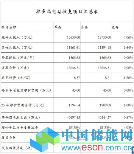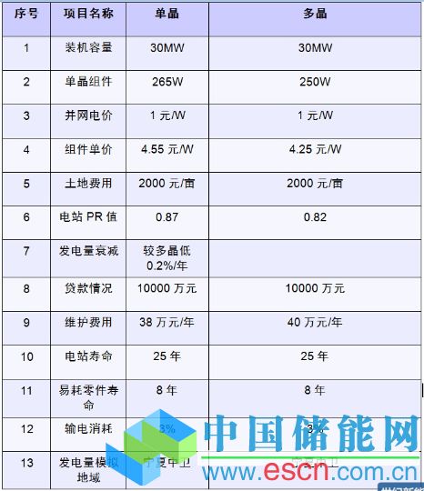 1、265W單晶和250W多晶,單晶組件售價(jià)以4.55元/W,多晶組件售價(jià)約為4.25元/W,根據(jù)30MWp電站EPC合同中各項(xiàng)項(xiàng)目單價(jià)算出電站初始投資:采用單晶組件電站投資約為8.37元/W,采用多晶組件電站投資約為8.22元/W;相差0.15元/W。