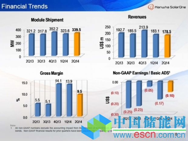 中國儲能網(wǎng)訊:一級光伏制造商韓華新能源(HanwhaSolarOne)報告,2014年第二季度組件平均銷售價格、毛利率及收入降低,而出貨量略有提高。
