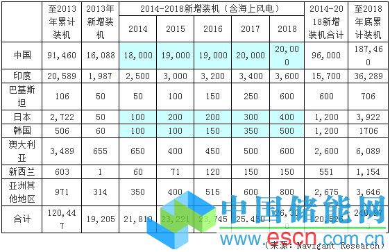 2014-2018年,中國將繼續(xù)保持每年新增容量榜首的位置,美國緊隨其后;