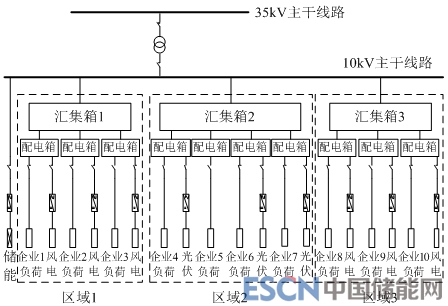 微網(wǎng)分為3塊區(qū)域,均為大工業(yè)用戶(hù),電壓等級(jí)為10kV,最大負(fù)荷為11.13MW。項(xiàng)目壽命周期為20年,設(shè)備綜合造價(jià)及相關(guān)成本參考當(dāng)?shù)貥?biāo)準(zhǔn),基準(zhǔn)折現(xiàn)率取7%。傳統(tǒng)運(yùn)營(yíng)模式下微網(wǎng)項(xiàng)目總投資約1.62億元,其中源側(cè)約14500萬(wàn)元,網(wǎng)側(cè)投約310萬(wàn)元,儲(chǔ)側(cè)約900萬(wàn)元,信息化平臺(tái)(能量管理系統(tǒng))約500萬(wàn)元;一體化運(yùn)營(yíng)模式總投資約1.68億元,其中源網(wǎng)儲(chǔ)側(cè)投資變化不大,信息化平臺(tái)(大數(shù)據(jù)云計(jì)算平臺(tái)、微平衡市場(chǎng)交易系統(tǒng)、能量管理系統(tǒng))約1100萬(wàn)元。圖7為微網(wǎng)接線方案示意圖。