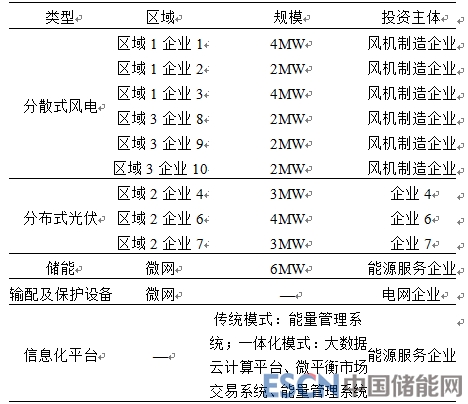 微網(wǎng)內(nèi)分布式光伏裝機(jī)容量為10MW,分散式風(fēng)電裝機(jī)容量為16MW,儲(chǔ)能裝機(jī)容量為6MW,并網(wǎng)點(diǎn)35kV/10kV變電站容量為16MW。電源、輸配電設(shè)備、儲(chǔ)能、信息化平臺(tái)等由不同主體投資。表2為微網(wǎng)設(shè)備規(guī)模和投資主體情況。