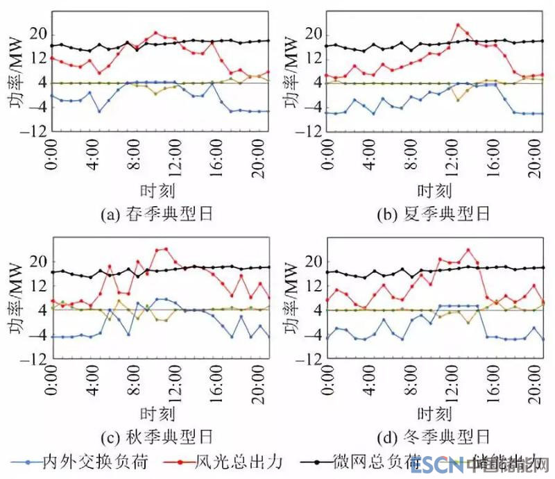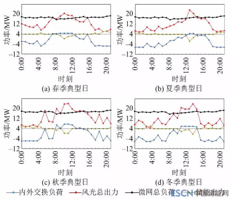 圖9和圖10為傳統(tǒng)運(yùn)營(yíng)模式和一體化運(yùn)營(yíng)模式下,春、夏、秋、冬四季典型日微網(wǎng)的運(yùn)行情況(儲(chǔ)能出力負(fù)值表示充電,內(nèi)外交換負(fù)荷負(fù)值表示外。