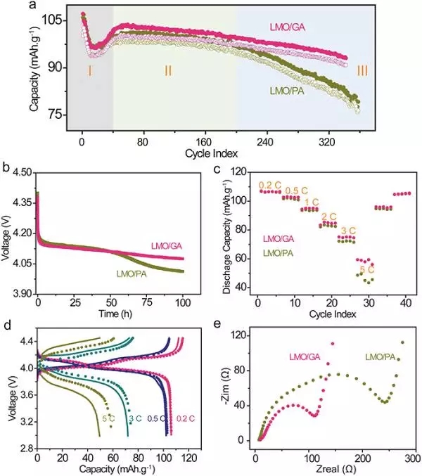 (e) LMO/PA 和LMO/GA電池的電化學(xué)阻抗分析。