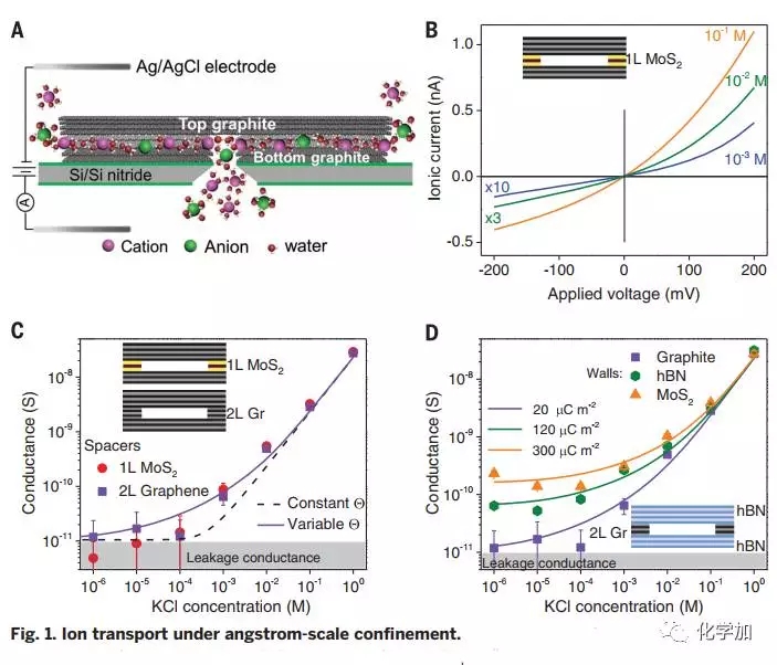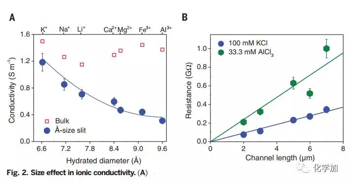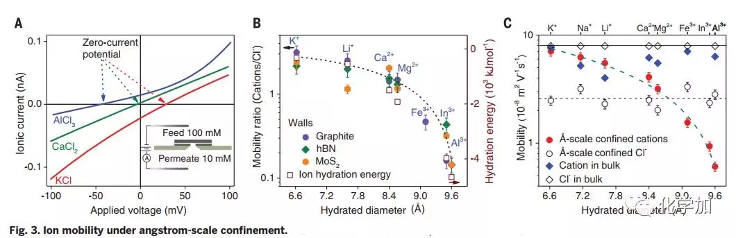 來自英國、中國的科研團(tuán)隊(duì)通過調(diào)控分子間范德華作用力,組裝得到具有原子級別光滑表面的石墨烯通道,僅兩層石墨烯厚度不同于準(zhǔn)一維納米管和生物通道,這種二維納米通道化學(xué)穩(wěn)定性良好,其高度潔凈表面使得通道表面電荷密度較此前文獻(xiàn)報(bào)道值低3-4個(gè)數(shù)量級,可以阻隔水合直徑>13 ?的離子,這可以通過位阻效應(yīng)予以解釋。
