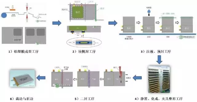 軟包鋰離子電芯主要包括:鋁塑膜成型、頂封與側(cè)封、注液與預(yù)封、化成與整形、排氣與二封、裁邊與折邊。