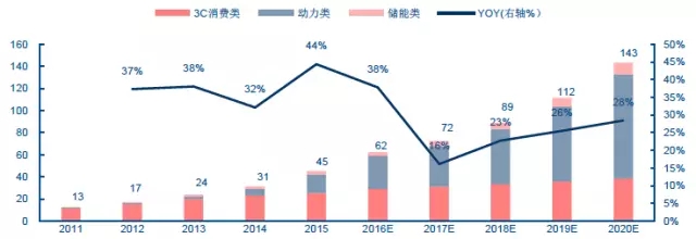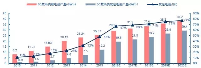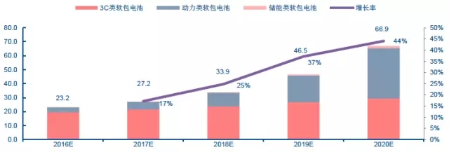 動(dòng)力電池需求和滲透率齊頭并進(jìn),3C消費(fèi)類穩(wěn)定增長(zhǎng),軟包電池總需求量到2020年有望達(dá)到67GWh,3年CAGR達(dá)35%,預(yù)計(jì)市場(chǎng)規(guī)模將超過(guò)500億。