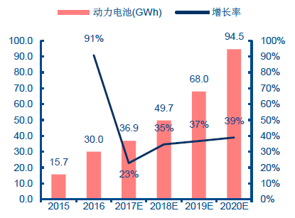 鋰電池需求保持高增長(zhǎng)。根據(jù)起點(diǎn)研究SPIR統(tǒng)計(jì),2016年中國(guó)鋰電3C數(shù)碼類占鋰電總產(chǎn)量52%,2017上半年中國(guó)鋰電3C數(shù)碼類占總產(chǎn)量41%,而動(dòng)力類從2016年43%提升到年上半年55%。預(yù)計(jì)到2020年,中國(guó)鋰電池的總需求可達(dá)143GWh,3年CAGR達(dá)27%,其中動(dòng)力電池需求有望達(dá)94.5GWh,占比達(dá)66%,新能源汽車將成為鋰電池總需求增長(zhǎng)的最強(qiáng)驅(qū)動(dòng)力。