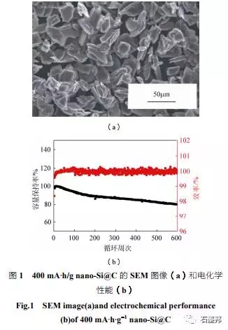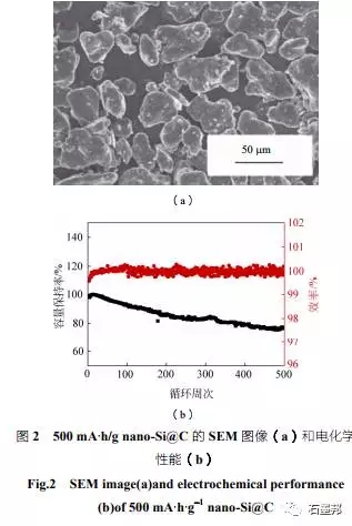 在氧化亞硅碳復(fù)合材料方面,已經(jīng)有較為成熟的軟碳包覆工藝,在固相條件下對原材料表面進(jìn)行高溫?zé)崽幚恚梢杂行岣卟牧鲜仔?、增加?dǎo)電性、緩解膨脹。目前,項(xiàng)目組已經(jīng)可以制備批次穩(wěn)定性較高的碳包覆氧化亞硅材料,并且在合作單位取得了較好的測試結(jié)果反饋。如420 mA·h/g 的碳包覆氧 化亞硅材料,匹配正極鋰鎳錳酸鋁(NCA),制備成3A·h規(guī)格為20650的鋼殼電池,在1C充電、 10C放電的測試條件下,循環(huán)500 周容量保持80% (圖3)。