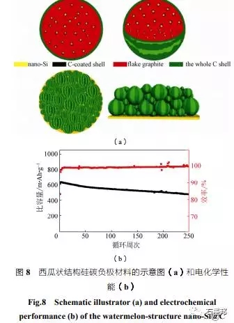碳包覆納米硅是以納米硅為原材料,表面包覆碳層的結(jié)構(gòu)。其中硅材料的粒徑為30~200nm,碳層多采用瀝青高溫碳化處理后形成的軟碳。其單體容量一般為400~2000mA·h/g,成本較低,首效較高,但電池膨脹較大,長循環(huán)穩(wěn)定性較差。