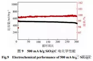 在氧化亞硅碳復(fù)合材料方面,項(xiàng)目組主要通過控制氧含量以及與第二相復(fù)合對氧化亞硅的電化學(xué)性能進(jìn)行優(yōu)化。其中,對氧化亞硅中硅晶粒的調(diào)控取得了進(jìn)展并在表面電荷作用下制備出表界面穩(wěn)定的高容量氧化亞硅碳負(fù)極材料,有效地提高了氧化亞硅的首次及后續(xù)庫侖效率,改善了其循環(huán)穩(wěn)定性。為進(jìn)一步改善電極材料的高壓實(shí)條件下的性能,項(xiàng)目組采用包覆工藝,并通過對材料復(fù)合過程的控制,也取得了較大進(jìn)展。比容量500 mA·h/g 在1C充放條件下其電化學(xué)性能如圖9所示。石墨邦 www.shimobang.cn —國內(nèi)首家碳石墨電商平臺(tái)
