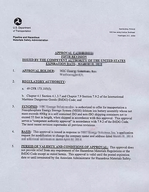 目前在美國(guó)運(yùn)輸此類產(chǎn)品之前,都必須獲得美國(guó)交通部(DOT)PHMSA的特別批準(zhǔn)文件后才能進(jìn)行公路、鐵路、海洋運(yùn)輸。然而能夠通過(guò)并且獲得DOT的審批,需要提交復(fù)雜的文件和漫長(zhǎng)的等待,而最終獲得過(guò)特別批準(zhǔn)的也僅為極少數(shù)的美國(guó)知名制造商。