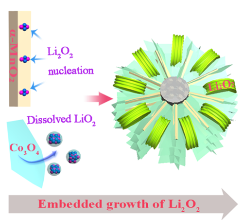 中國儲能網(wǎng)訊:鋰空氣電池因具有超高的理論能量密度而被認為是電動汽車的潛在動力電源。鋰氧電池的放電產(chǎn)物過氧化鋰(Li2O2)具有絕緣、不溶的特性,因此,隨著放電的進行,電極表面會逐漸被其鈍化而導(dǎo)致放電終止。大尺寸Li2O2的生成有助于延緩正極表面的鈍化、延長放電時間、提高電池容量。然而,大尺寸Li2O2在電極表面往往隨機散落,難以保證其與電極材料之間的有效接觸,從而限制了電池的倍率性能和能量效率。因此,亟需實現(xiàn)大尺寸Li2O2在電極材料中的嵌入式生長。