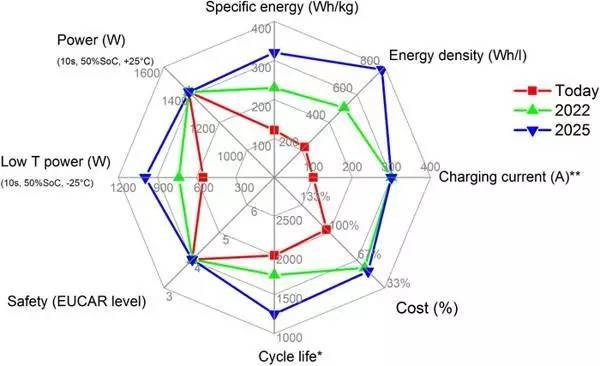 圖1現(xiàn)有動力電池的技術(shù)指標以及未來10年的發(fā)展目標