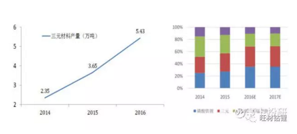 三元電池的正極材料是鎳鈷錳酸鉀三元材料,統(tǒng)計(jì)數(shù)據(jù)顯示,2016年中國鋰電三元材料產(chǎn)量5.43萬噸,同比增長48.8%;產(chǎn)值79.8億元,同比增長超過60%,其技術(shù)構(gòu)成占比在四種正極材料(磷酸鐵鋰、三元材料、鈷酸鋰、錳酸鋰)中最高。