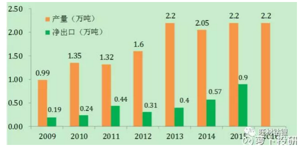 國內(nèi)氫氧化鋰產(chǎn)量增長在2013年后趨于穩(wěn)定,但出口量上升明顯。