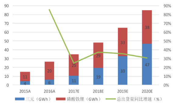 未來動力電池出貨情況進(jìn)行了預(yù)測,由于其他動力電池占比較小,僅以磷酸鐵鋰和三元兩種動力電池進(jìn)行預(yù)測。預(yù)計未來動力電池總出貨量將以年復(fù)合增速 35.79% 的速度增長,到 2020 年,出貨量將達(dá) 85GWh 。其中三元電池占比逐年提高,2019 年將與磷酸鐵鋰電池各占半壁江山,并于2020 年市場份額達(dá)到55% ,現(xiàn)出貨量實現(xiàn)47GWh。