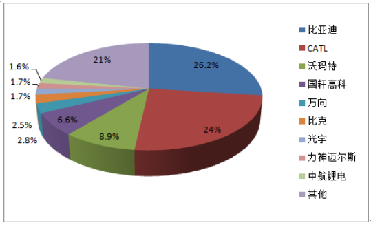 動力電池生產(chǎn)企業(yè)中,比亞迪與 CATL2016 年分別出貨 7.35GWh和 6.72GWh ,合到計市場份額達(dá)到 50.2% ,沃瑪特與國軒高科市場占有率也分別為8.9%和 和 6.6%余企業(yè)2016 年動力電池出貨量均小于1Gh,前10 名企業(yè)合計市場占有率達(dá)79% ,市場集中度較高。