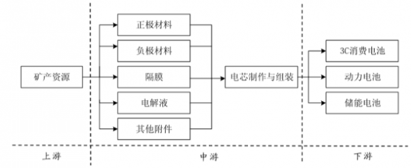 鋰電池行業(yè)上游是鋰電池材料所需的礦產(chǎn)資源,包括鋰礦、鎳礦、鈷礦、錳礦以及石墨礦等;中游為鋰電池生產(chǎn)廠商,包括正極材料、負(fù)極材料、電解液、隔膜、導(dǎo)電劑和粘合劑的生產(chǎn)商等,下游主要是鋰電配套應(yīng)用領(lǐng)域,目前已廣泛用于 3C 消費類電子產(chǎn)品、電動汽車、工業(yè)儲能等領(lǐng)域。