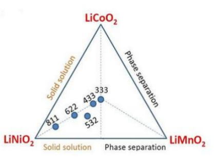 根據(jù)所含金屬離子種類的不同,三元正極材料又可進(jìn)一步分為鎳鈷錳酸鋰三元材料(NCM)和鎳鈷鋁酸鋰三元材料(NCA)兩種。由于鎳有提高材料能量密度的作用, NCM 材料根據(jù)三種過渡金屬離子占比的不同,又可進(jìn)一步分為低鎳的 NCM424、NCM333、NCM523 以及高鎳的 NCM622、NCM811等材料。NCA 中由于鋁元素含量較少,主要為鎳、鈷兩種元素,因此也為高鎳三元材料的一種。目前國內(nèi)動力電池均為NCM體系,產(chǎn)業(yè)化進(jìn)程主要是從低鎳的 NCM333、523 等向高鎳的 622、811 方向發(fā)展,國外與國內(nèi)進(jìn)程類似,但在 622 向 811 發(fā)展階段之間有 701515 過渡。