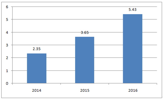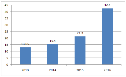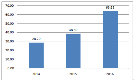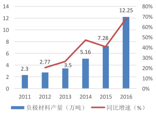 我國鋰電池負(fù)極材料產(chǎn)量增速基本維持逐年遞增態(tài)勢,2016 年全年實現(xiàn)產(chǎn)量12.25萬噸,同比增長68.27% ,實現(xiàn)產(chǎn)值64 億元,同比增長64% ,產(chǎn)值增速與產(chǎn)量增速基本相同。