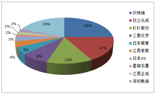 目前,全球負(fù)極市場基本呈現(xiàn)中日兩極爭霸格局,前四名企業(yè)中日各有兩家,合計市場占有率達(dá) 63%。 國內(nèi)市場來看,貝特瑞、杉杉股份和江西紫宸占據(jù)前三位臵,三者市場占有率超過 55%,但受動力電池需求拉動人造石墨市場影響,三者的占比差距已進(jìn)一步縮小。