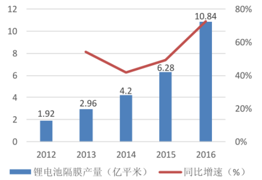 2016 年我國鋰電隔膜產(chǎn)量超過10.84 億平米長,同比增長72.6% 。其中,干法隔膜出貨 6.23 億平米,同比增長 58.5% ;濕法隔膜出貨 4.61 億平米,同比增長96.2%。 。2014 年起,濕法隔膜產(chǎn)量總量比重已達(dá) 42.5% ,超過干法單拉隔膜產(chǎn)量。從產(chǎn)值來看,2016 年鋰電隔膜實現(xiàn)產(chǎn)值 42.5 億元,同比增長接近一倍,近年來首次超過產(chǎn)量增速,分析主要由于前幾年隔膜產(chǎn)能過剩,價格不斷下跌,而今年濕法隔膜進(jìn)口替代已初見成效,隔膜總國產(chǎn)化率從2014 年的 65%上升到 2016 年的 85%所致。
