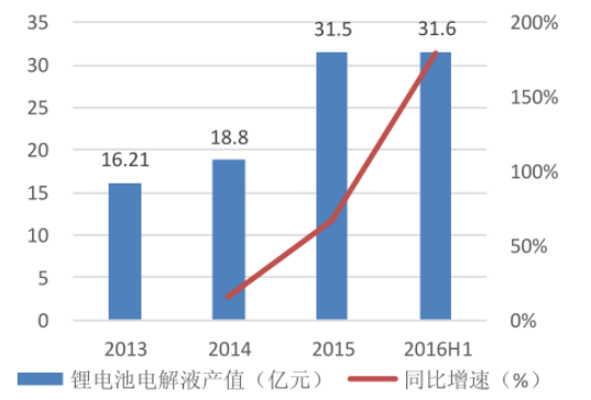 2016 年上半年我國鋰電池電解液出貨 3.97 萬噸,同比增長 65.4%。電解液產(chǎn)值31.6億元,同比增長180%,增速明顯大于出貨量增速,分析主要由于原材料六氟磷酸鋰價格同比增長近 3 倍所致。2016 年全年全國電解液產(chǎn)量達(dá) 8.84 萬噸,產(chǎn)值達(dá) 59.9 億元。