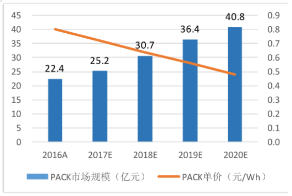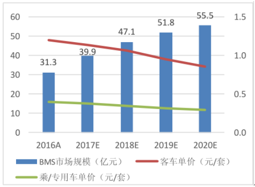 客車由于單體電池容量大,電壓等級高,因而BMS 成本較高,目前價格在 1.2 萬元/套左右,乘用車電壓等級較低,成本較低,價格大約在 3000-5000 元/套左右,專用車與乘用車成本基本相同。目前三元電芯和磷酸鐵鋰電芯單價大約分別為 1.2 元/Wh和 1 元/Wh 左右,PACK 后價格大約在 1.8-2 元/Wh 左右,估計 PACK 環(huán)節(jié)目前價格 0.8 元/Wh,以此為基礎(chǔ)對新能源汽車 BMS 及鋰電 PACK 市場規(guī)模進(jìn)行預(yù)測, 預(yù)計到 2020 年,BMS 市場規(guī)模將達(dá) 55.47億元電,鋰電PACK 市場規(guī)模將達(dá) 40.8 億元,年復(fù)合增速分別為15.4%和16.2%。