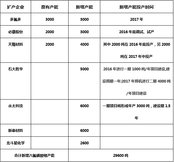 2015年以來部分六氟磷酸鋰新增產(chǎn)能情況
