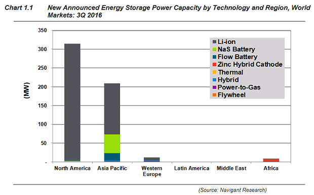 中國儲能網(wǎng)訊:根據(jù)美國清潔技術(shù)研究機(jī)構(gòu)Navigant Research發(fā)布的最新報告稱,截止2016年9月底,全球新增儲能容量近2吉瓦。