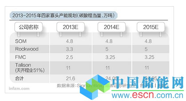 2013-2015 年四家寡頭產(chǎn)能規(guī)劃(碳酸鋰當量,萬噸) (曾子穎/圖)