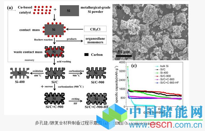 中國(guó)儲(chǔ)能網(wǎng)訊:目前廣泛使用的商業(yè)鋰離子電池負(fù)極材料主要為石墨,其理論容量為372mAh/g,并且開發(fā)已接近理論值,很難適應(yīng)未來大容量、高功率、低成本的化學(xué)電源的需求,如電動(dòng)汽車和電網(wǎng)調(diào)峰儲(chǔ)能等等。因此,大量研究瞄準(zhǔn)硅基負(fù)極材料,因?yàn)樗哂袠O高的理論儲(chǔ)鋰容量(4200mAh/g),被認(rèn)為是最有希望取代目前石墨的下一代負(fù)極材料。但是由于硅基材料在充放電過程中發(fā)生巨大的體積變化,導(dǎo)致電池在循環(huán)過程中電極材料會(huì)發(fā)生破裂、粉化、結(jié)構(gòu)崩塌等缺點(diǎn),加上硅的導(dǎo)電性能很低,致使不可逆容量較高、循環(huán)穩(wěn)定性較差。目前研發(fā)工作主要集中在納米、薄膜、多孔、合金、復(fù)合等結(jié)構(gòu)的硅基負(fù)極材料,但是這些材料的制備方法普遍存在成本高、工藝復(fù)雜、設(shè)備要求苛刻、批量生產(chǎn)困難等問題,難以規(guī)?;慨a(chǎn)。最近,中國(guó)科學(xué)院過程工程研究所蘇發(fā)兵研究員領(lǐng)導(dǎo)的能源催化與多孔材料課題組(http://cpme.mpcs.cn/)開發(fā)了一種可規(guī)模化制備多孔硅復(fù)合負(fù)極材料的方法,研究結(jié)果發(fā)表在德國(guó)應(yīng)用化學(xué)期刊(Angew. Chem. Int. Ed. 2014, 53, 5165-5169)。