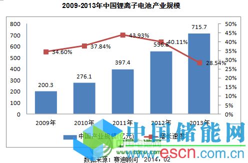 得益于低廉的生產(chǎn)成本和強(qiáng)大的加工制造能力,2000年以后全球的鋰離子電池制造逐步由日本和韓國(guó)向中國(guó)轉(zhuǎn)移。2013年,中國(guó)鋰離子電池的產(chǎn)業(yè)規(guī)模達(dá)到715.70億元,同比增長(zhǎng)28.54%左右,賽迪顧問預(yù)計(jì)隨著日本和韓國(guó)等鋰離子電池企業(yè)將電池的生產(chǎn)基地轉(zhuǎn)移到國(guó)內(nèi),中國(guó)鋰離子電池產(chǎn)業(yè)規(guī)模將保持較快的速度增長(zhǎng),到2015年將突破1000億元。