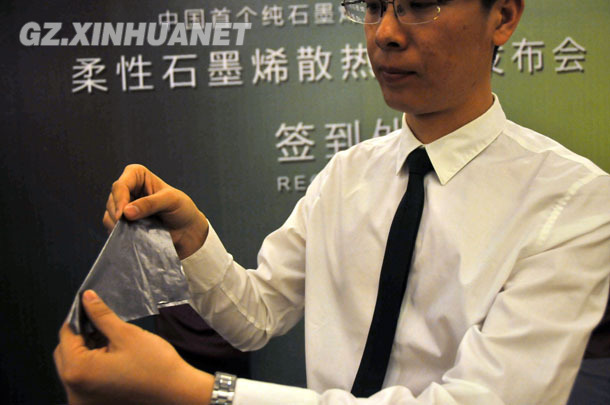 貴州新碳高科公司技術總監(jiān)王恭凱博士展示其公司研發(fā)的柔性石墨烯散熱薄膜(4月2日攝)