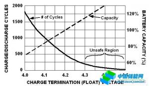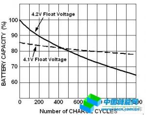大多數(shù)鋰離子電池制造商都設(shè)置了一個4.2V浮動電壓,以此作為容量和周期壽命之間的最佳平衡。用4.2V作為恒定限壓值(浮動電壓)時,電池一般可以提供約500個充電/放電周期,然后電池容量降至80%。一個充電周期由一個滿充電至一個滿放電過程組成。多個淺放電過程合起來構(gòu)成一個滿充電周期。