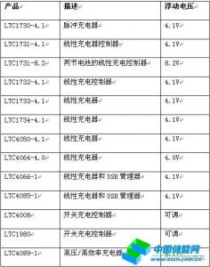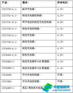 電池充電器延長電池壽命的作用主要由充電器的浮動電壓和充電終止方法決定。凌力爾特公司的很多鋰離子電池充電器具有4.2V±1%(或更低)的固定浮動電壓,但是有一些產(chǎn)品為4.1V和4.0V以及具有可調(diào)浮動電壓。圖4顯示了一些具有較低浮動電壓的電池充電器,用來給4.2V鋰離子電池充電時可以延長電池壽命。