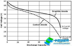 可以預(yù)料,放電時,電池電壓會緩慢下降。放電電壓曲線隨時間的變化取決于幾個因素,包括放電電流、電池溫度、電池老化程度和電池使用的陽極材料類型。目前,大多數(shù)鋰離子電池使用焦炭或石墨。每種電池的電壓曲線如圖6所示。使用比較廣泛的石墨材料在容量的20%和80%之間放電電壓變化不大,然后在接近結(jié)束時迅速下降,而焦炭陽極具有比較陡的電壓斜坡和較低的2.5V截止電壓。用焦炭材料時剩余電池容量更容易確定,簡單測量電池電壓就可以了。