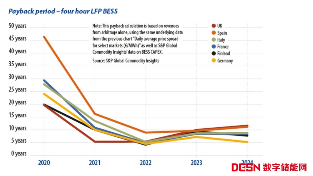 圖1 持續(xù)時(shí)間為4小時(shí)電池儲(chǔ)能系統(tǒng)的投資回報(bào)時(shí)間快速下降