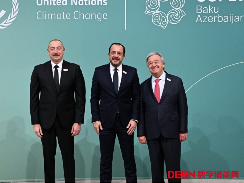 塞浦路斯總統(tǒng)尼科斯··赫里斯托祖利季斯(中)在阿塞拜疆舉行的COP29氣候大會(huì)上與聯(lián)合國(guó)秘書(shū)長(zhǎng)安東尼奧·古特雷斯(右)合影