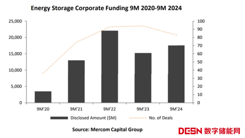 在2024年前三季度的61筆交易中,儲(chǔ)能行業(yè)廠商獲得風(fēng)險(xiǎn)投資額降至27億美元,降幅高達(dá)69%,而去年同期68筆交易中的風(fēng)險(xiǎn)投資額為86億美元。與此同時(shí),2024年前三季度22筆交易中的債務(wù)和公開(kāi)市場(chǎng)融資飆升至150億美元,同比增長(zhǎng)125%,而去年同期26筆交易中的債務(wù)和公開(kāi)市場(chǎng)融資為66億美元。