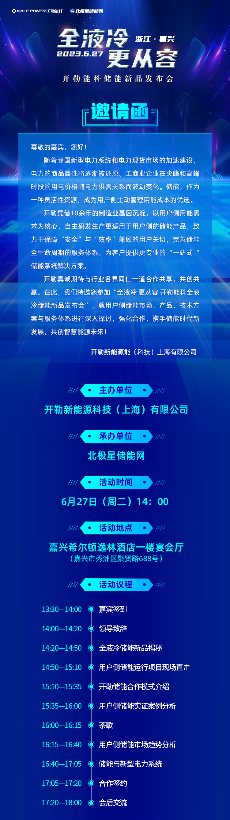 2023年6月27日,由開(kāi)勒能科主辦,北極星儲(chǔ)能網(wǎng)承辦的全液冷 更從容 開(kāi)勒能科全液冷儲(chǔ)能新品發(fā)布會(huì)將在浙江嘉興隆重舉行。開(kāi)勒能科將攜全液冷儲(chǔ)能系統(tǒng)新品重磅亮相,與會(huì)嘉賓還可現(xiàn)場(chǎng)直擊其用戶側(cè)儲(chǔ)能項(xiàng)目案例實(shí)戰(zhàn)效果。